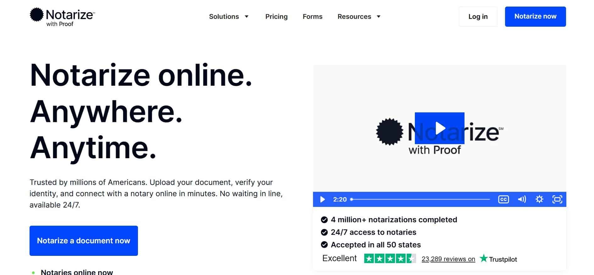Notarize is arguably the best-known name in online notarization. It operates 24/7 and connects users with a notary from its network on-demand, usually within minutes. If you happen to need a quick one-off notarization at odd hours, that convenience is a big plus.