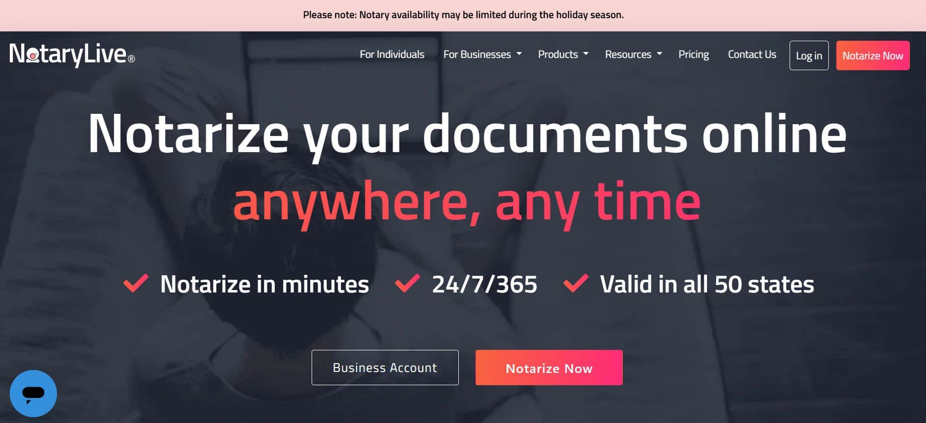 - Availability: Notarize is open 24/7, and you can usually get a document notarized at any time of day or night. There’s no need to plan ahead; you just log in and request a notary when you need one, and the process will generally be underway within minutes.