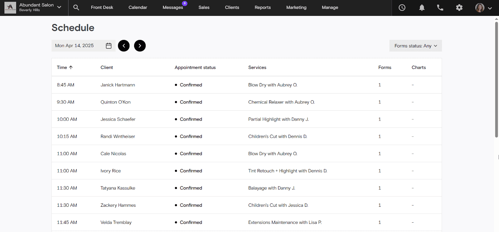 On the top right-hand section of the front desk, your eyes are intuitively drawn to the other options. Rather than have a drop-down menu that opens to a new tab, you can click on the buttons you need, like “Schedule” to see the schedule for the day, which lists not only the client names but the service they have booked, and the time.