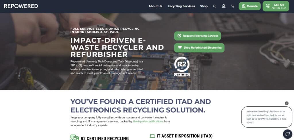 If environmental impact is a high priority, Repowered (formerly Tech Dump) is one of the strongest choices in Minnesota. They run NAID AAA–certified data destruction and a well-structured ITAD process, but they’re especially well known for their community and sustainability mission.