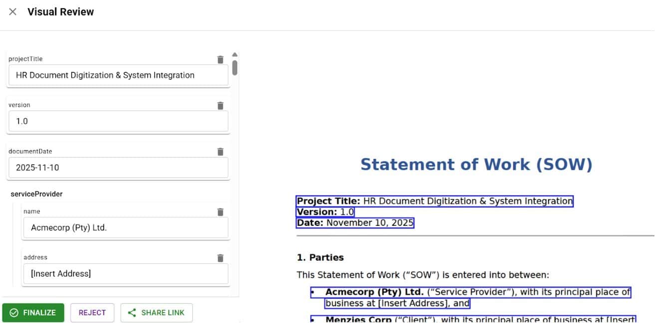 DocuPipe’s AI review helps you improve your document and correct any mistakes you’ve made — including identifying where all extracted sections come from so that you can make any necessary changes to your schema.