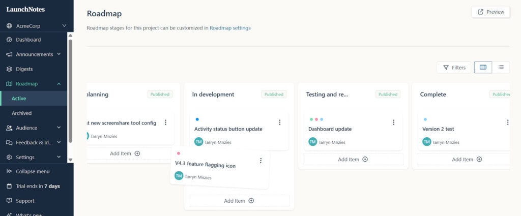 LaunchNotes has great drag-and-drop features, meaning you can easily navigate through various stages, which are customizable based on your requirements.