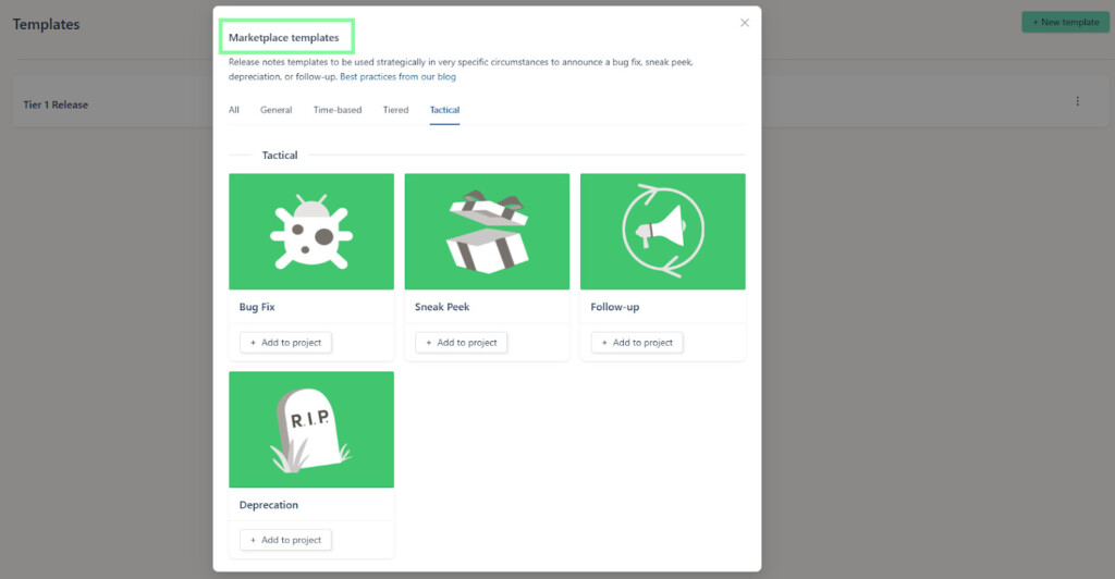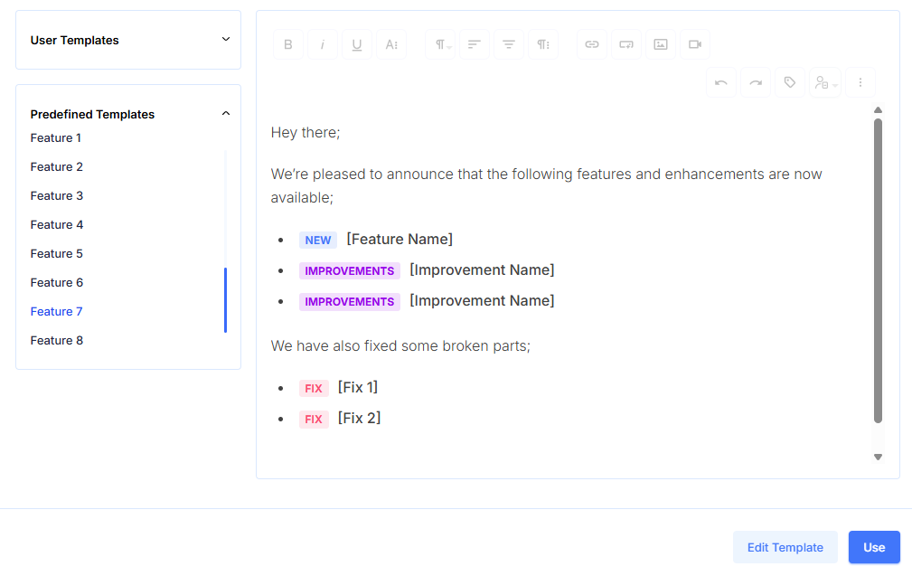 LaunchNotes has quite a few templates to choose from based on typical product release notes categories.