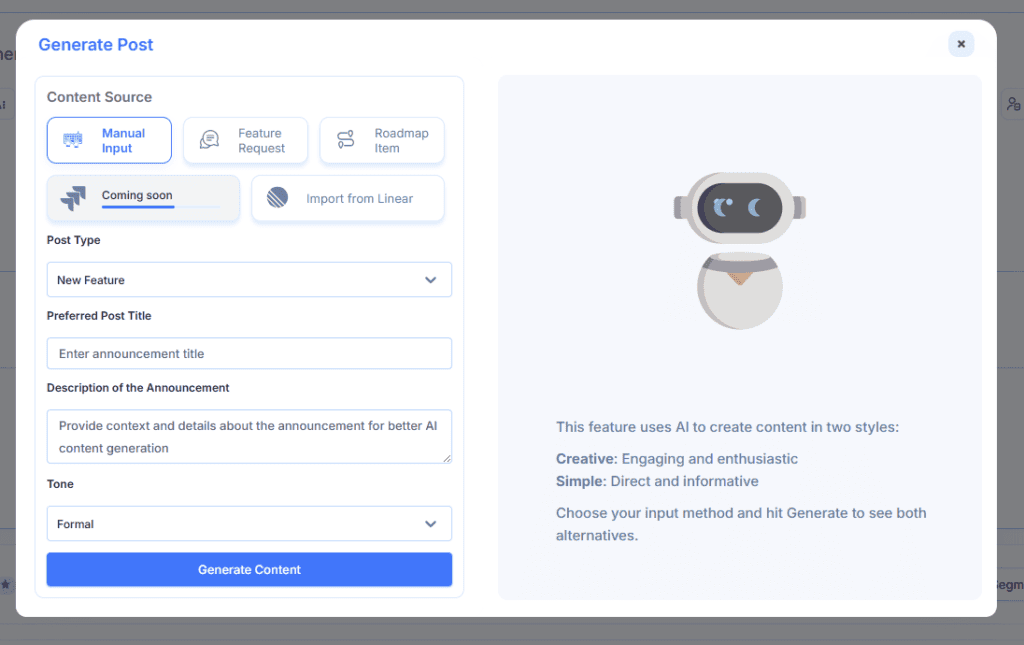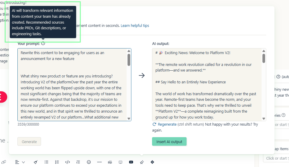 The AnnounceKit AI-assistant helps you generate AI-optimized content depending on your goal. Jira and Linear will be sources that you can import from in the near future as well, which is an excellent feature if you’re already using one of these tools!