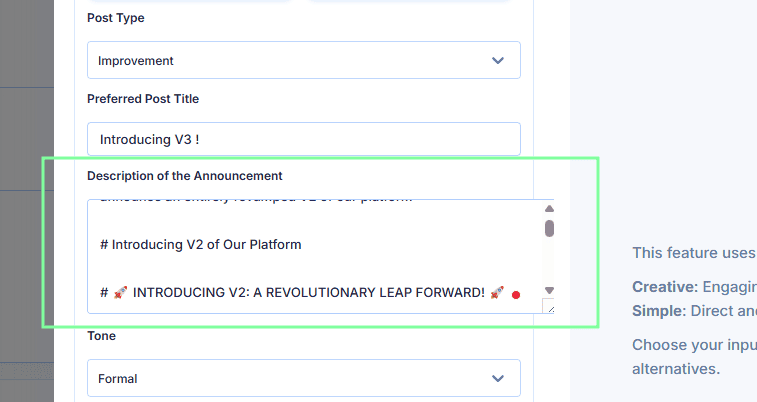 Another great feature I liked is LaunchNotes AI-assistance, which can help you draft engaging or optimized content depending on your goal.