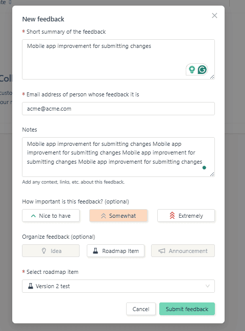 You can manually add this on behalf of users or stakeholders who may have provided this feedback. I like that the feedback or submitted ideas can be directly linked to roadmap items, which can then be prioritized easily by your product team.