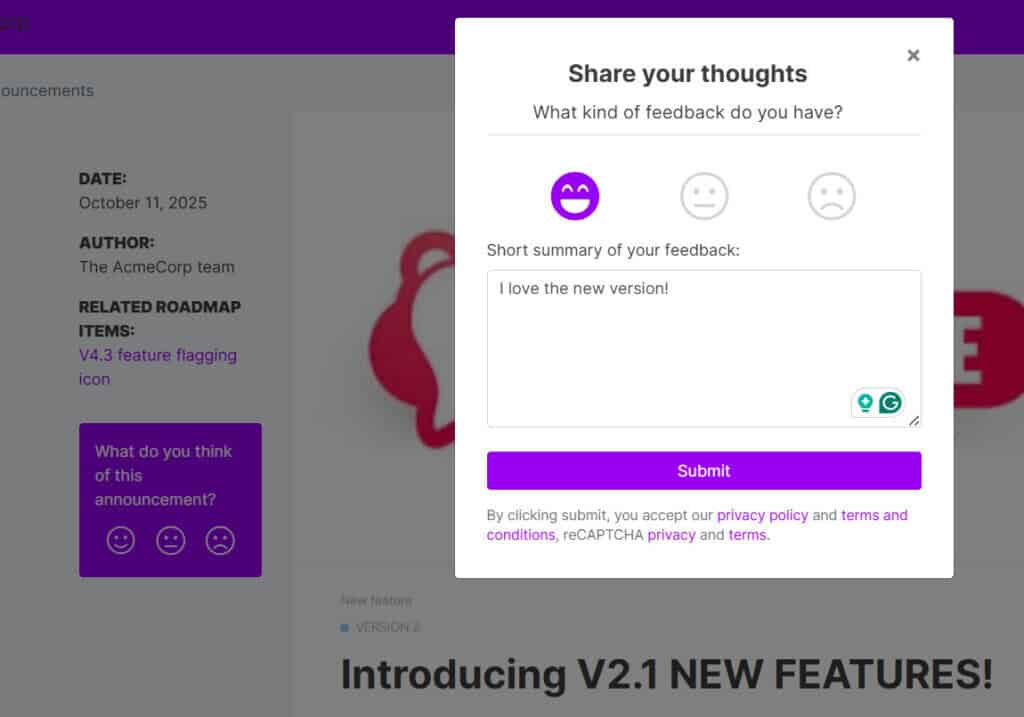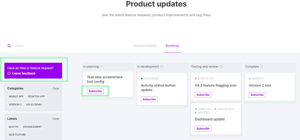 Users can also submit ideas or feedback directly from the announcements page or via the roadmap, which helps target users right where they’re seeing your updates.