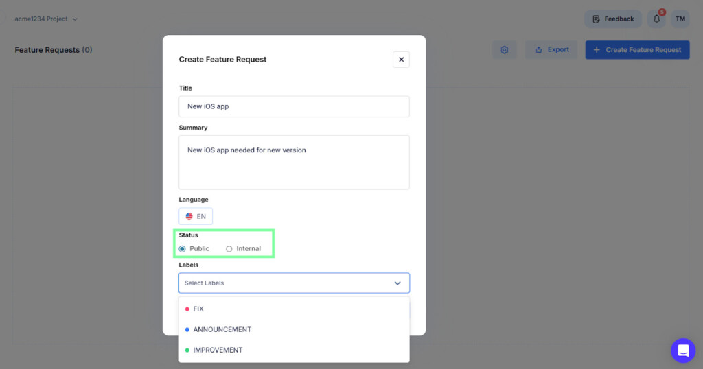 I like that you can also make the feature request public or internal, or add tags at this level.