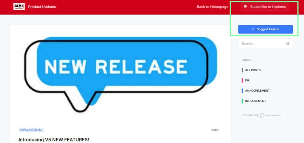 Like LaunchNotes, users can suggest features or subscribe to notifications directly on AnnounceKit’s announcements page.