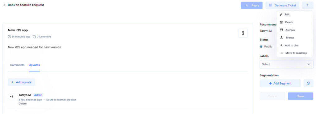 As a great value add, you can automatically generate a ticket, add upvotes (which include optional sources), and manage the feature request from within the tool: