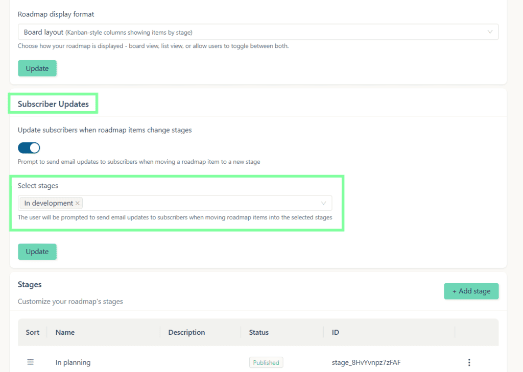 I really liked LaunchNotes subscriber updates that can be set up when customizing the roadmap. The subscriber updates allow you to send email notifications based on your personalized stages, which is a great way to keep specific users informed of any critical changes.
