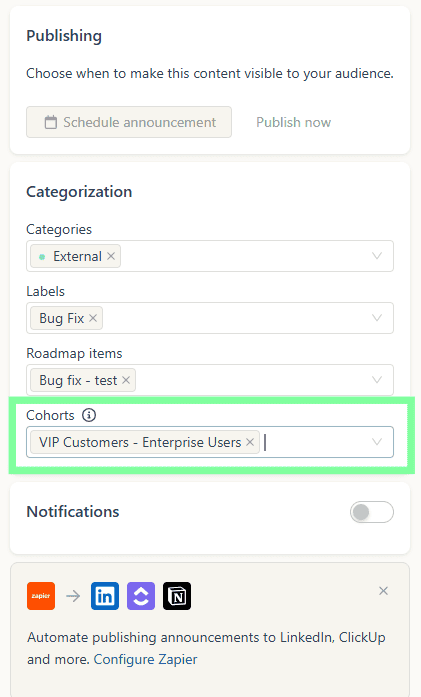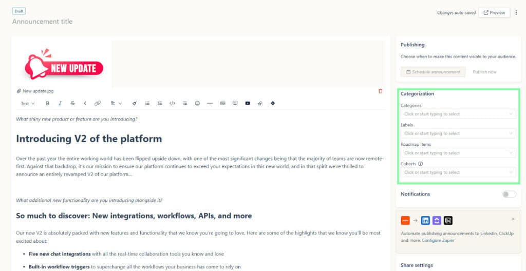 You can easily add categories, labels, or link your announcement to roadmap items from your announcement page.