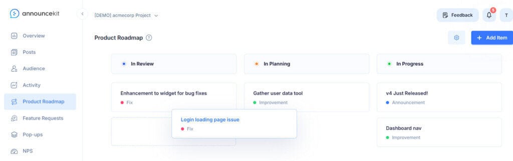 Similar to LaunchNotes, Announcekit has a dedicated feedback and idea management area where you can manually add or import user feedback.