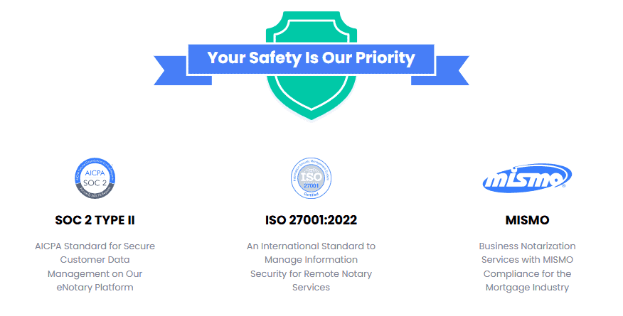OneNotary publishes SOC 2 Type II and ISO/IEC 27001:2022 on its site and links to its SOC 2 Type II report. It also markets MISMO compliance for mortgage workflows. For non-mortgage use or where the bank’s checklist focuses on SOC/ISO, this is strong.