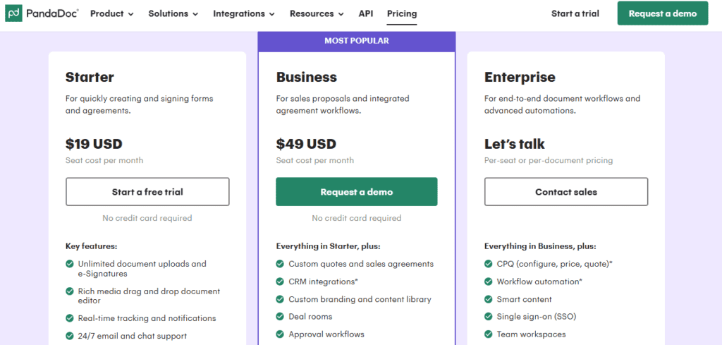 PandaDoc Notary funnels you to “book a demo” for pricing. PandaDoc’s core e-signature product has public seat pricing, but Notary is a feature for Business (paid add-on) and Enterprise plans (wow, that was a technical answer on how much something costs!). In practice, you’ll model cost around your seat licenses plus a Notary add-on and usage. If your team already runs PandaDoc for proposals and contracts, the bundle may still pencil out. Truth be told, I did not appreciate how confusing their pricing model was when I was trying to onboard myself. Essentially, it’ll be a cost per month per user for the subscription, anywhere from $50 to $90, and then a one-time fee per notarization depending on the volume of transactions.