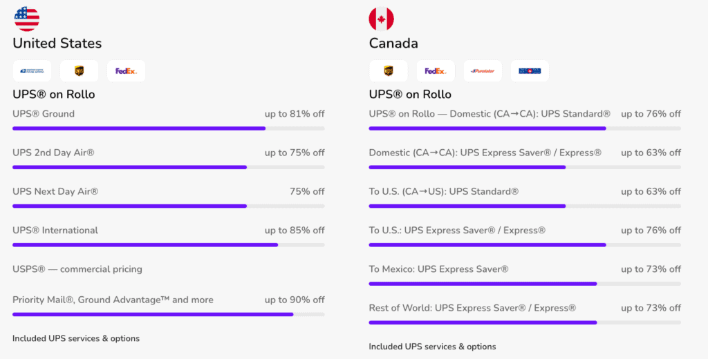 Both tools offer the main US and Canada shipping options, though Shippo has a wider selection of 40+ carriers as opposed to Rollo’s 5.