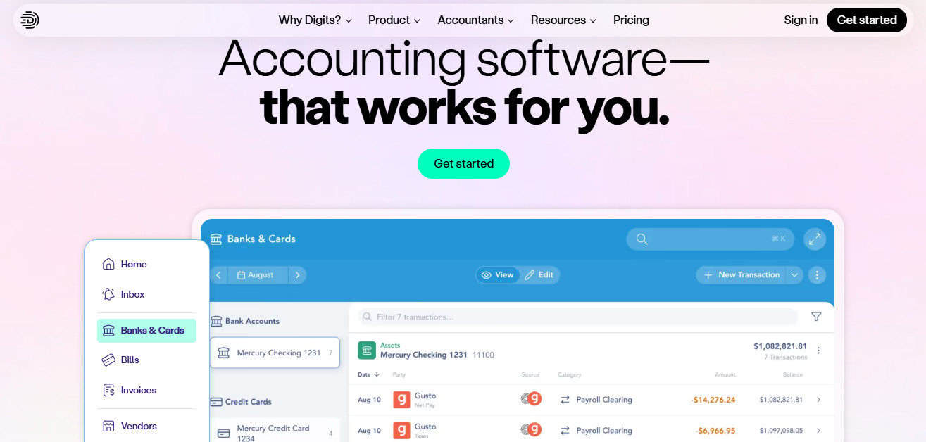 Digits is a newer entrant that has quickly become a favorite for tech-forward startups. It brands itself as “AI-native” accounting, meaning it wasn’t a traditional software that had AI “bolted on” later—it was built from the ground up to use machine learning. What I find most impressive about Digits is its Ask Digits feature, which acts like a financial assistant you can query in plain English (e.g., “How much did we spend on AWS last month compared to January?”). It’s designed for the founder who wants a real-time pulse on their burn rate and runway without waiting for a month-end report.