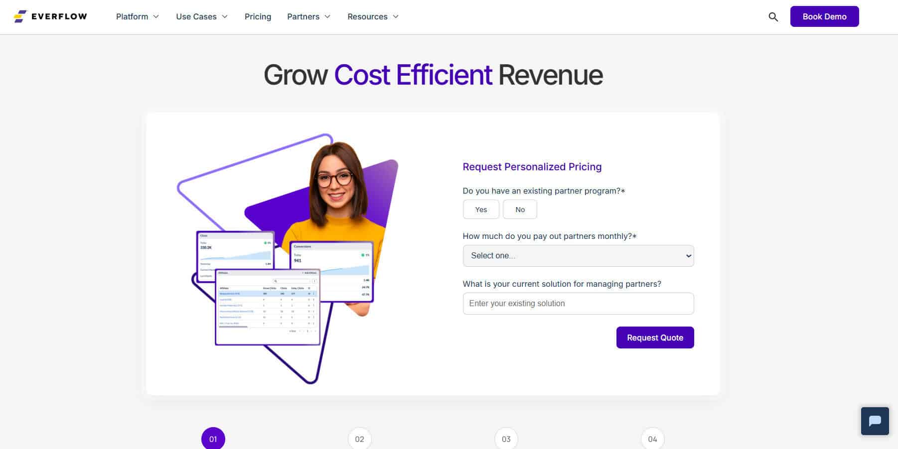 Everflow offers custom pricing so there’s no fixed starting price. However it’s definitely more expensive than mid-market tools like Tapfiliate.